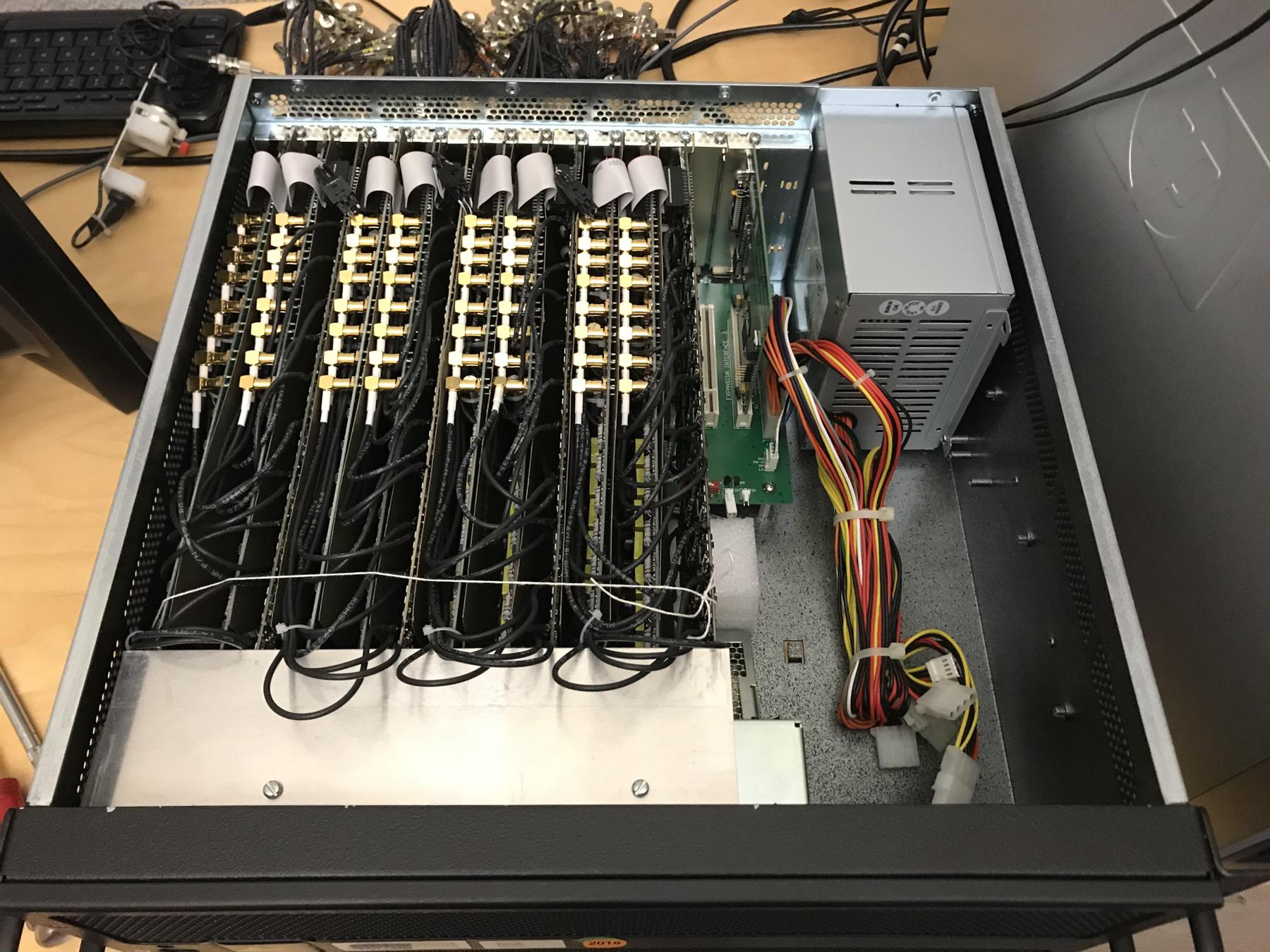 Multiple boards can be installed in the same computer for a data acquisition system with more than one hundred channels. With one board set as the master and remaining set to slave mode, all channels on the slave boards will start taking data upon receiving a trigger signal from the master board. The jitter between channels is less than 2 nanoseconds.