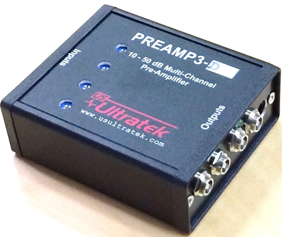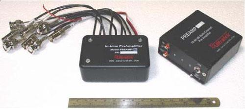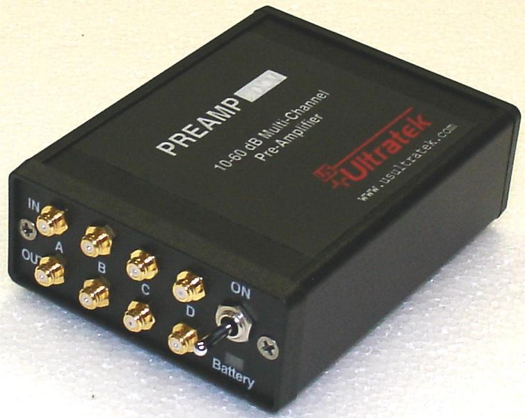 US Ultratek PREAMP2 pre-amplifiers are equipped in two different sets of dimensions. The dimensions of the compact module are 3" x 2" x 1". With the 9V battery option, which still provides up to 4 channels of amplifiers, the dimensions are 45/8" x 23/4" x 1". Each amplifier is independent from others, and the individual gains can be easily set by adjusting the potentiometers. All the input and output connections are protected from high voltage transients such as transducer excitation pulses. The output of the PREAMP2 iscapable of driving long coax cables over 300 feet (100 meters).